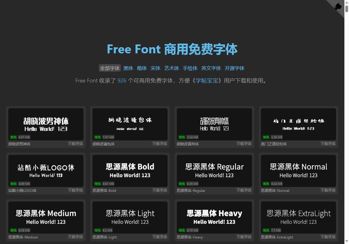 Free Font是一个收集了商用免费字体,包括汉字和英语,为用户提供了低成本 、高灵活性的解决方案。其中字体有多种格式和风格,可提供免费下载使用。
